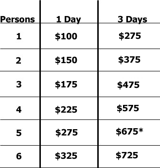 Breakfast and Supper meals, lodging(I can arrange from camping pads to Motel rooms),